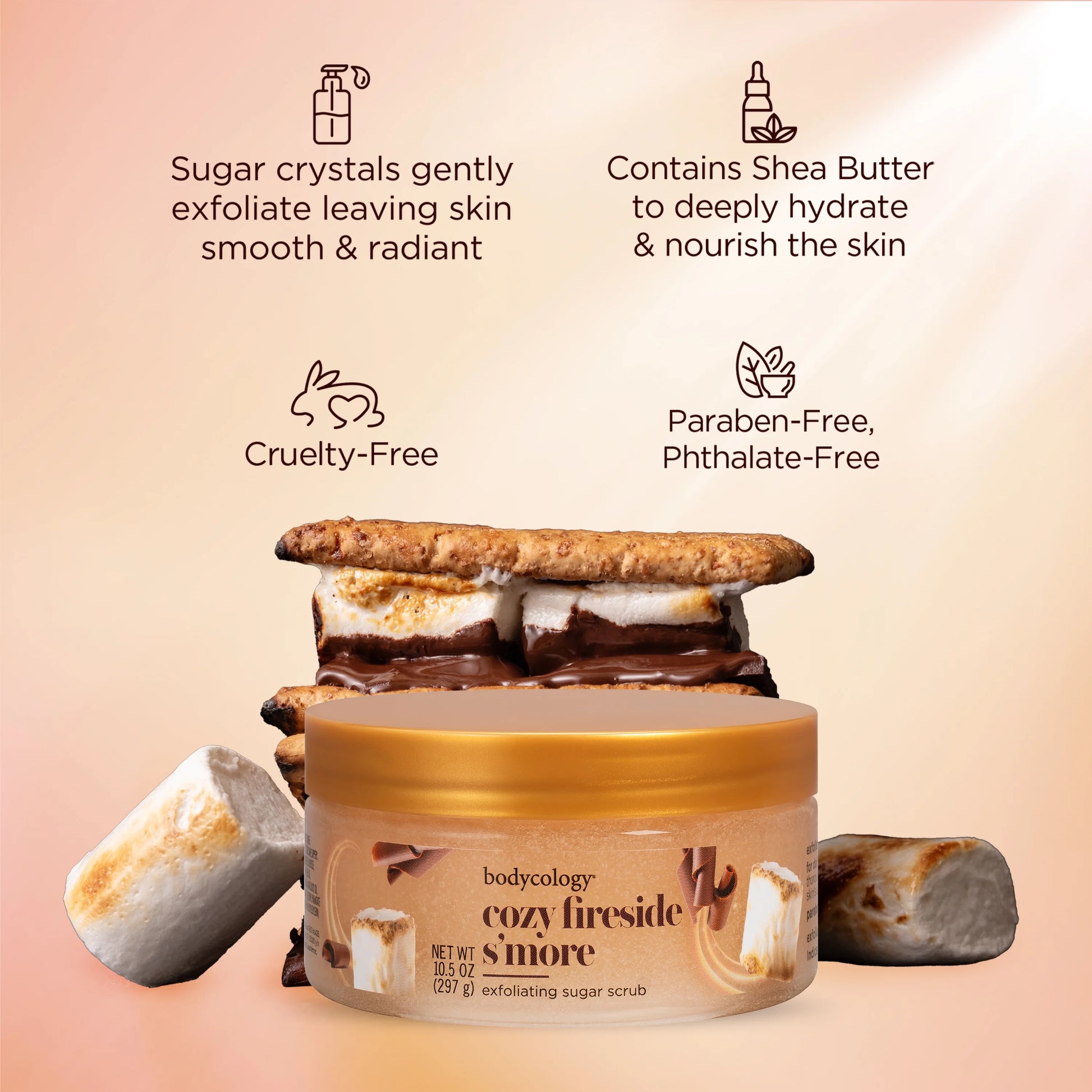 The Bodycology Exfoliating Sugar Scrub in Cozy Fireside S'more is a moisturizing body scrub that features the sweet scent of marshmallow, sandalwood, and milk chocolate. It uses sugar crystals to exfoliate dull skin, revealing a smoother, more radiant appearance, while shea butter hydrates the skin. This product aims to provide a spa-like experience, leaving the skin feeling soft and refreshed.