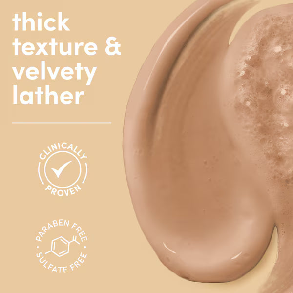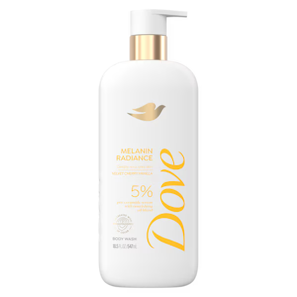 Dove Melanin Radiance Body Wash is a moisturizing body wash designed for melanin-rich skin that visibly improves dryness and enhances radiance. It features a 5% pro-ceramide serum and a nourishing oil blend to help strengthen the skin barrier and replenish moisture. This PETA-certified vegan formula, co-created with dermatologists of color, has a scent of black cherry and almond butter, is made with plant-based cleansers, and is free of sulfates and parabens.