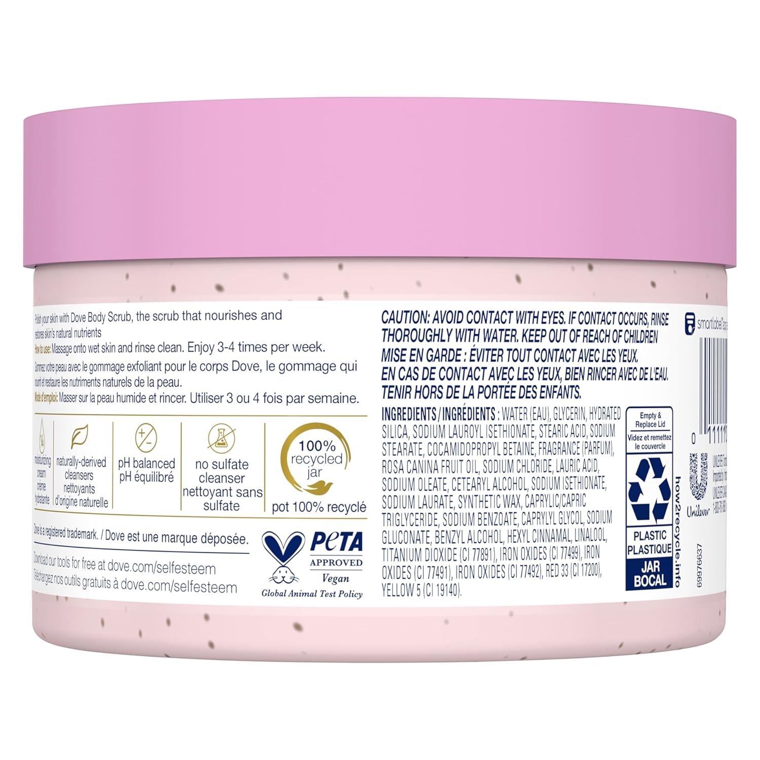 - THOUGHTFULLY MADE: This body scrub is PETA-certified and cruelty-free, so you can feel good about switching to Dove. It's a great addition to your skincare routine