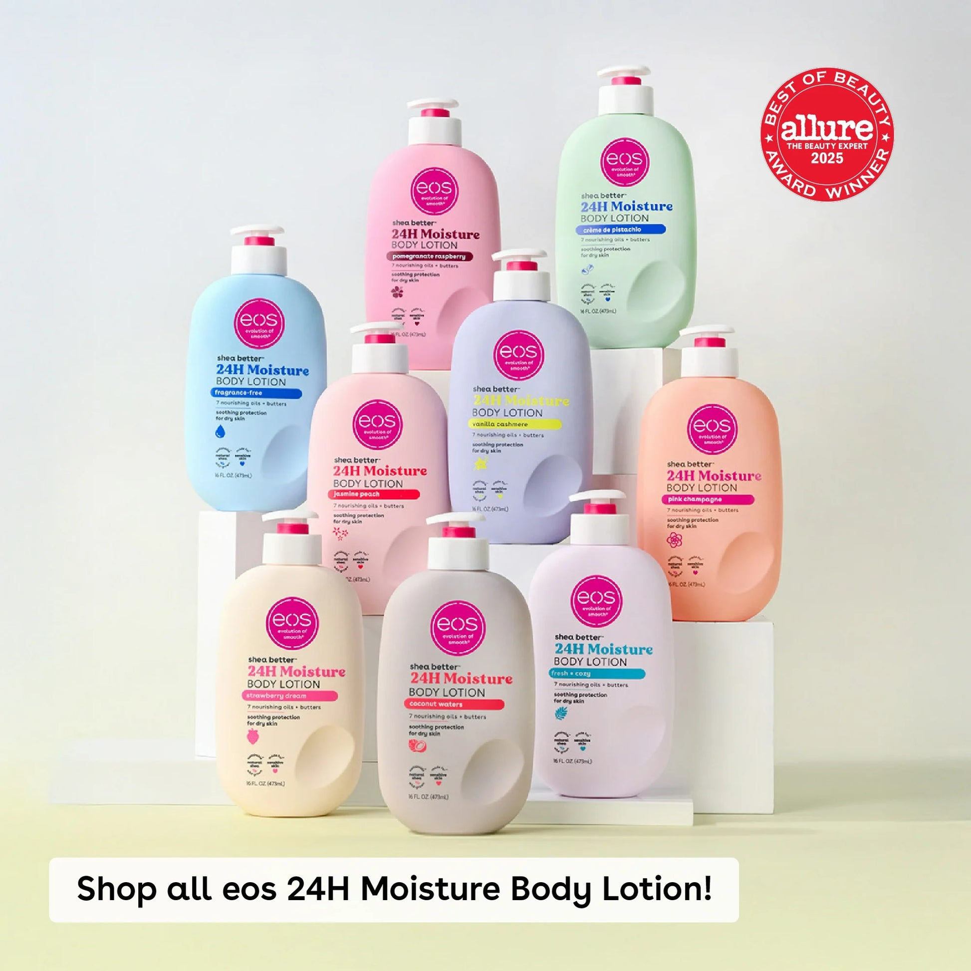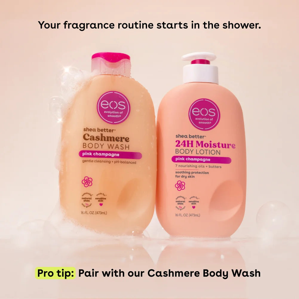 Our flirty & delightful Pink Champagne Body Lotion features notes of pear champagne, ruby pomegranate & plum suede. eos 24H body lotion with instantly moisturizing Shea Oil + lasting protection Shea Butter quickly absorbs for 24-hour hydration. Say hello to… fast-absorption, lightweight, soft skin, and sustainable shea. Say goodbye to… greasiness, heaviness, and sticky residue. Apply this fast-absorbing and deliciously scented body lotion to just-cleaned skin, paying special attention to dry, rough areas. Relax – we’ll do the rest.